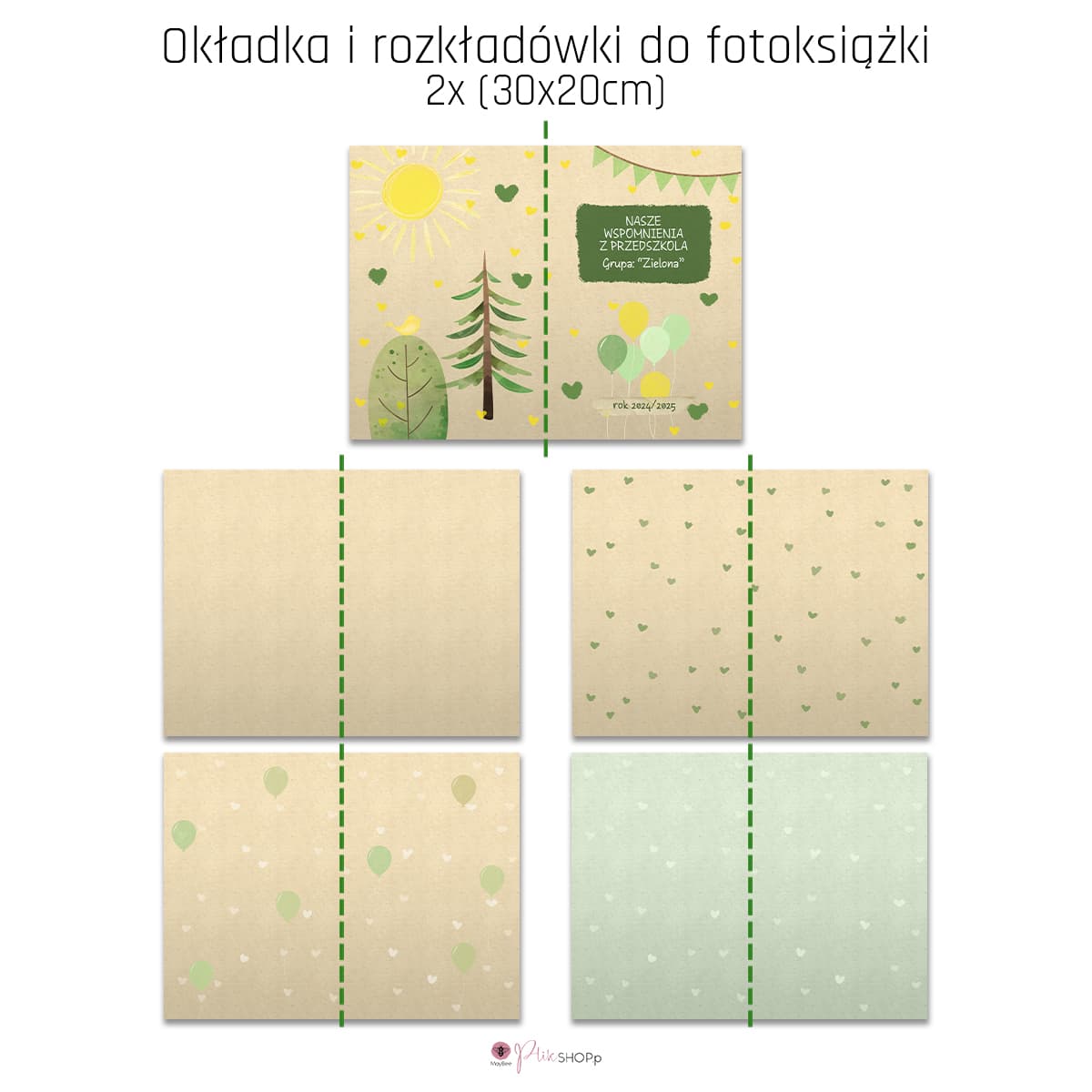 - 4 Rozkładówki 40x30 cm oraz strony pojedyncze 20x30 – przygotowane ze spadami, gotowe do druku (jako pliki JPG – tła pod zdjęcia). To gotowe tła, na które możesz swobodnie nanosić swoje zdjęcia. Dzięki nim szybko stworzysz spersonalizowaną pamiątkę jako spójną kolorystycznie i stylistycznie całość.