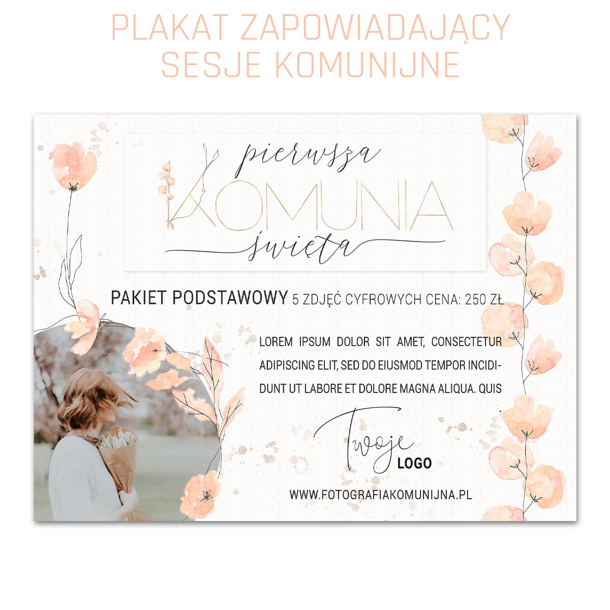 Plakat cyfrowy informujący o sesjach komunijnych.