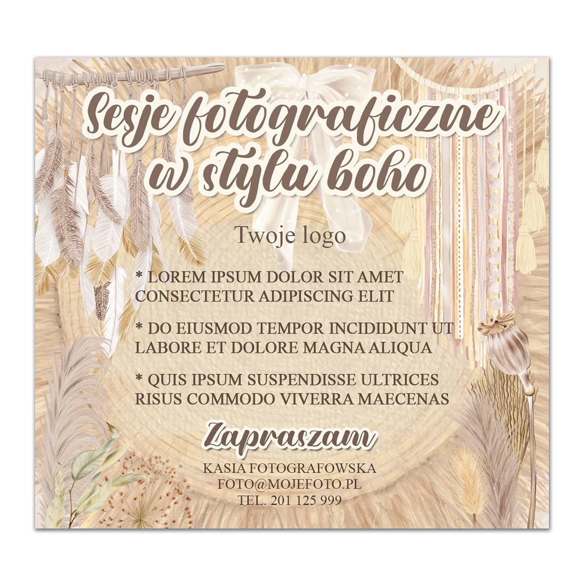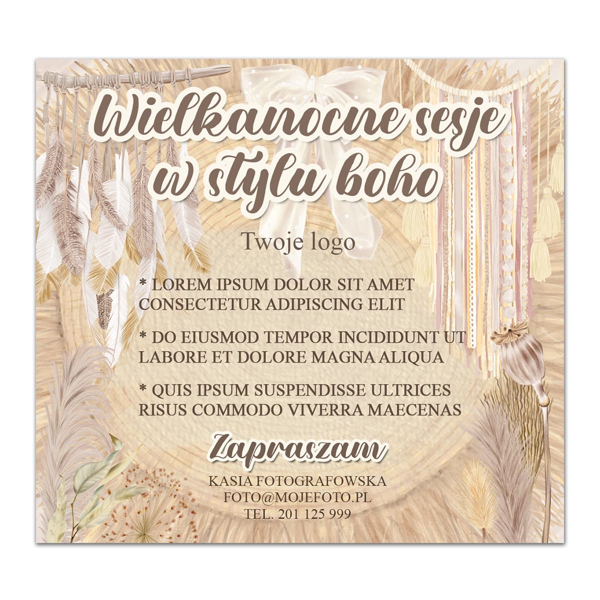 Plakat cyfrowy zapowiadający nie tylko wielkanocne sesje zdjęciowe. Dodatkowy napis: "Sesje Fotograficzne w stylu boho" nadają plakatowi uniwersalny charakter :)
