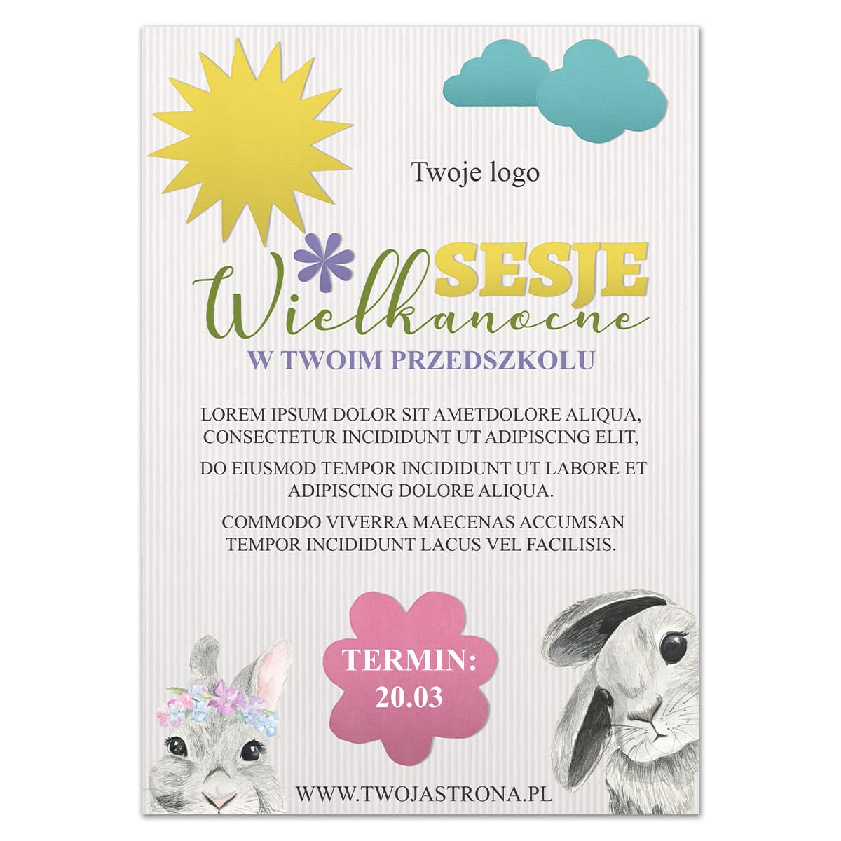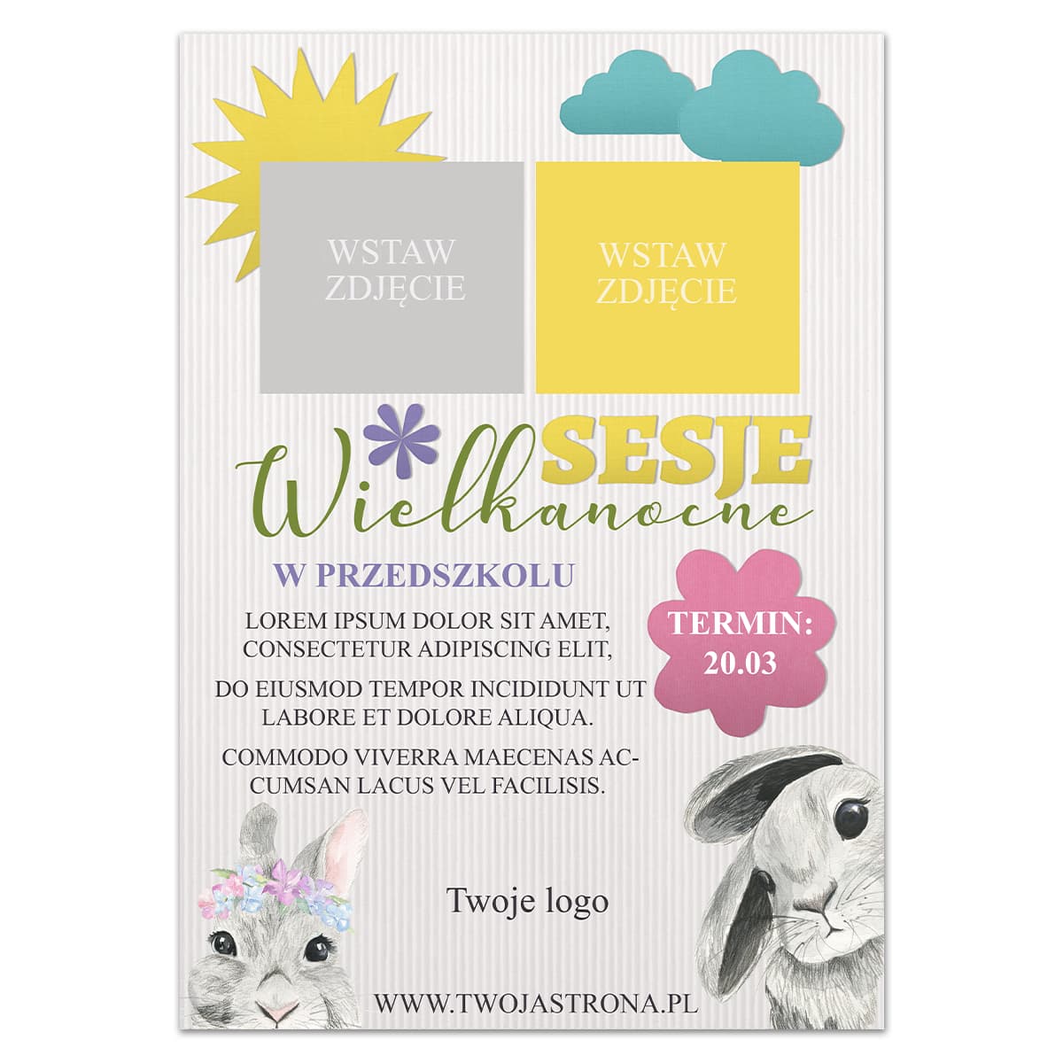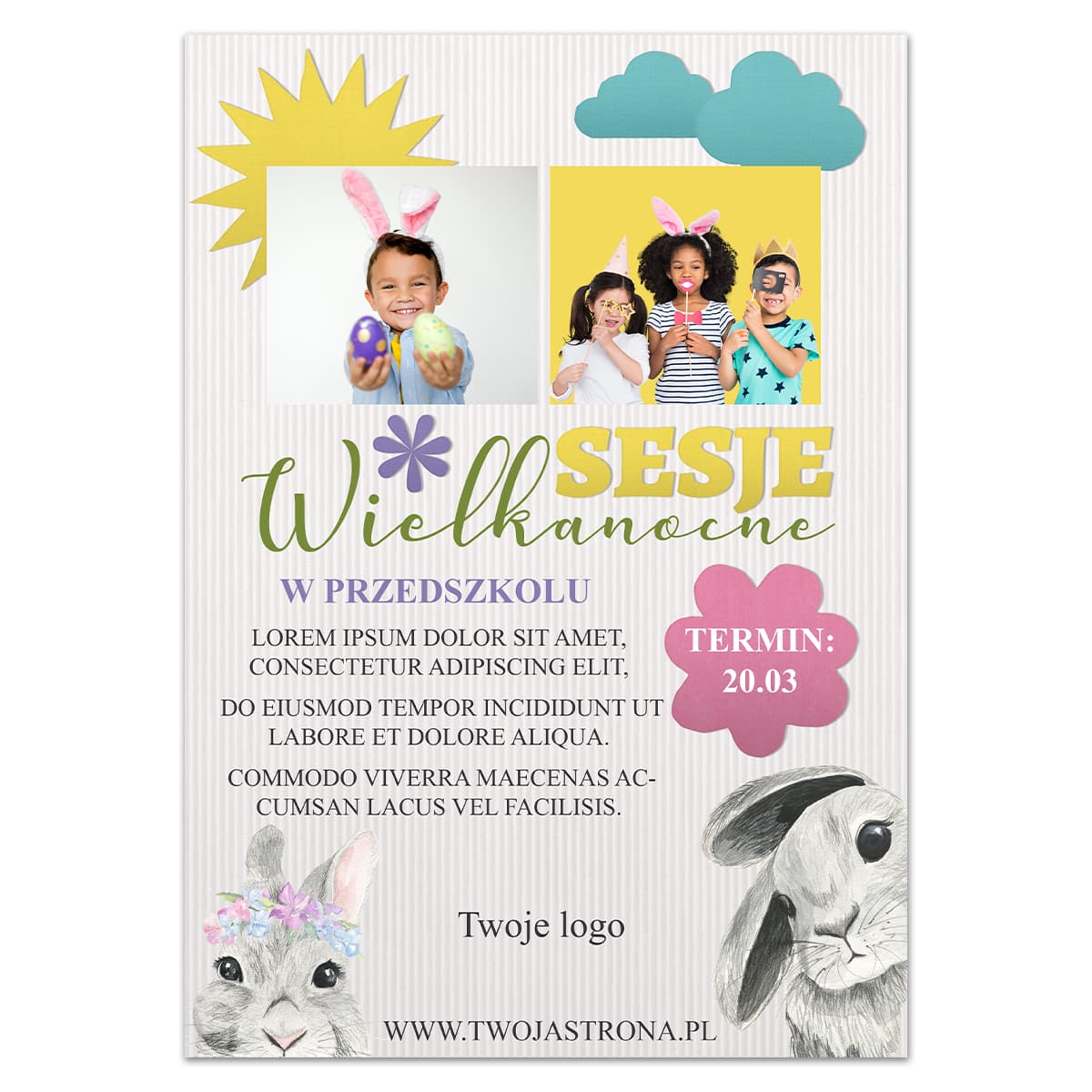 Plakat cyfrowy zapowiadający wielkanocne sesje zdjęciowe np. w przedszkolu. istnieje możliwość edycji napisu "w przedszkolu" - dzięki czemu plakat ma uniwersalny charakter.