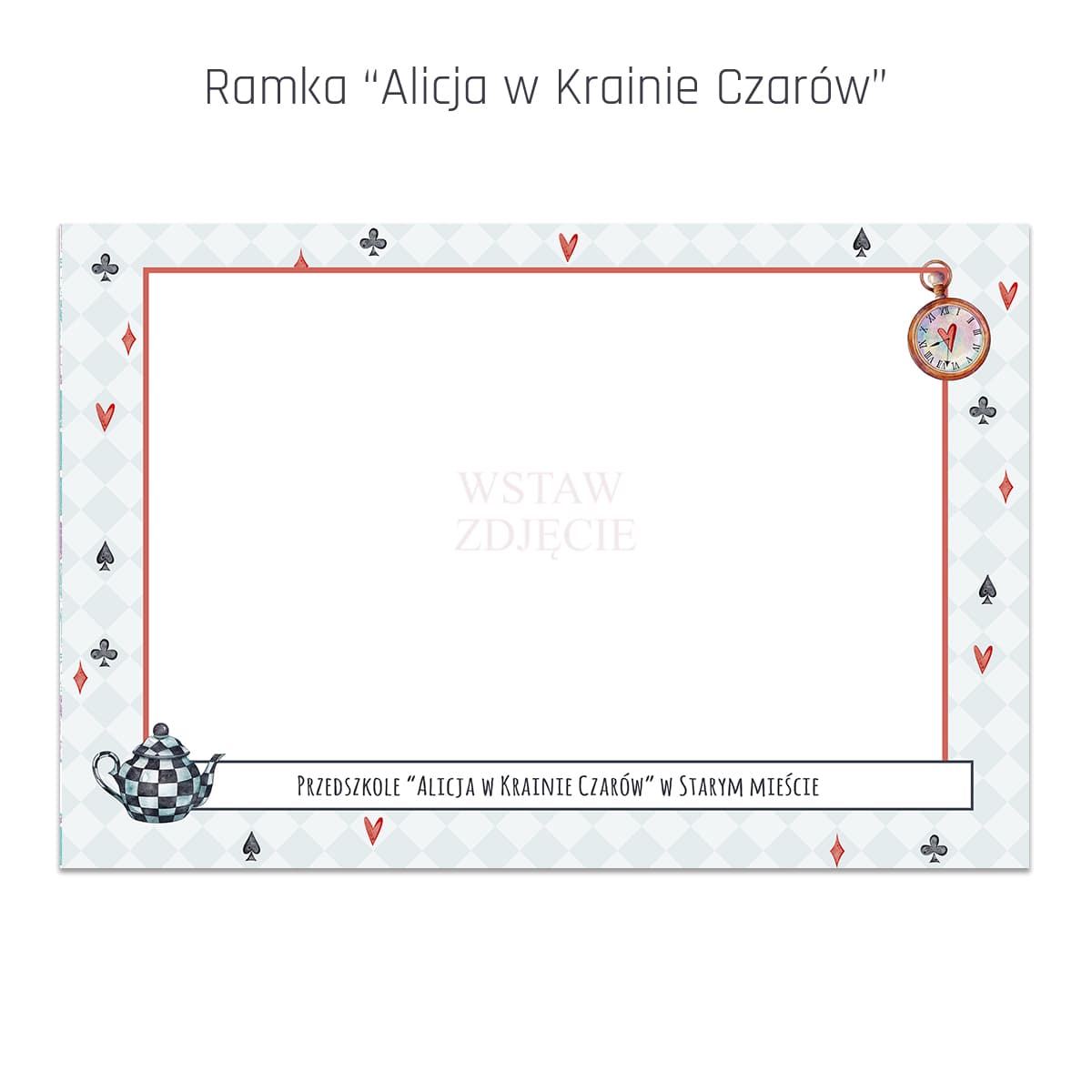 Szablon cyfrowy ramki szkolnej, przedszkolnej z modnym motywem Alicji w Krainie Czarów.