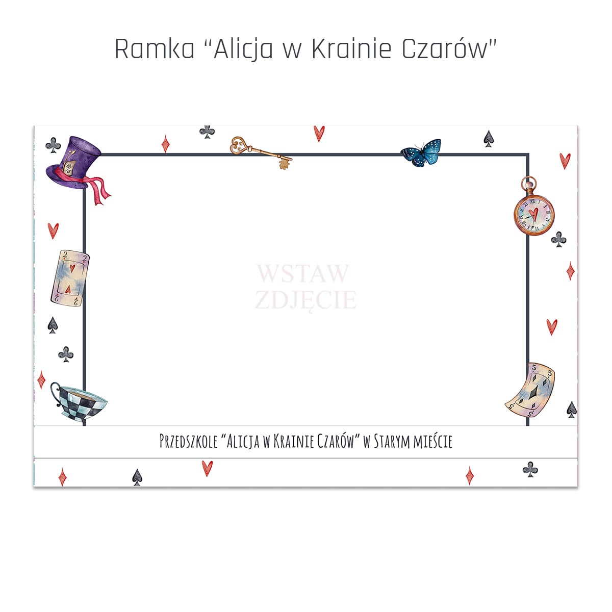 Szablon cyfrowy ramki szkolnej, przedszkolnej z modnym motywem Alicji w Krainie Czarów.