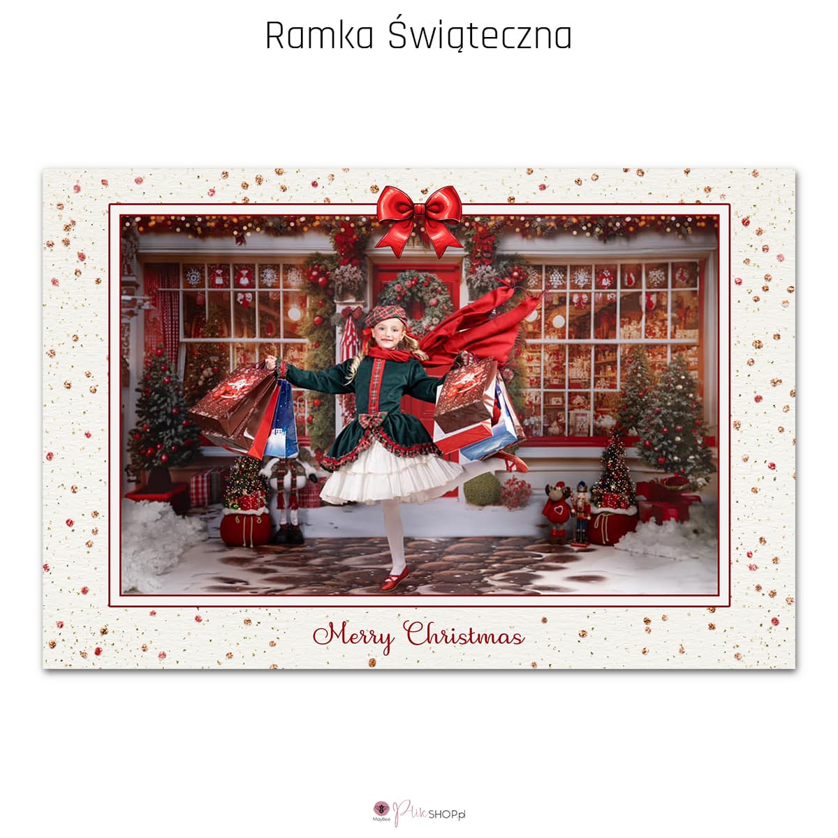 - Dwujęzyczność. Ramka posiada gotowe życzenia w dwóch wersjach językowych: Radosnych Świąt i Merry Christmas, aby trafić do szerszego grona klientów.
