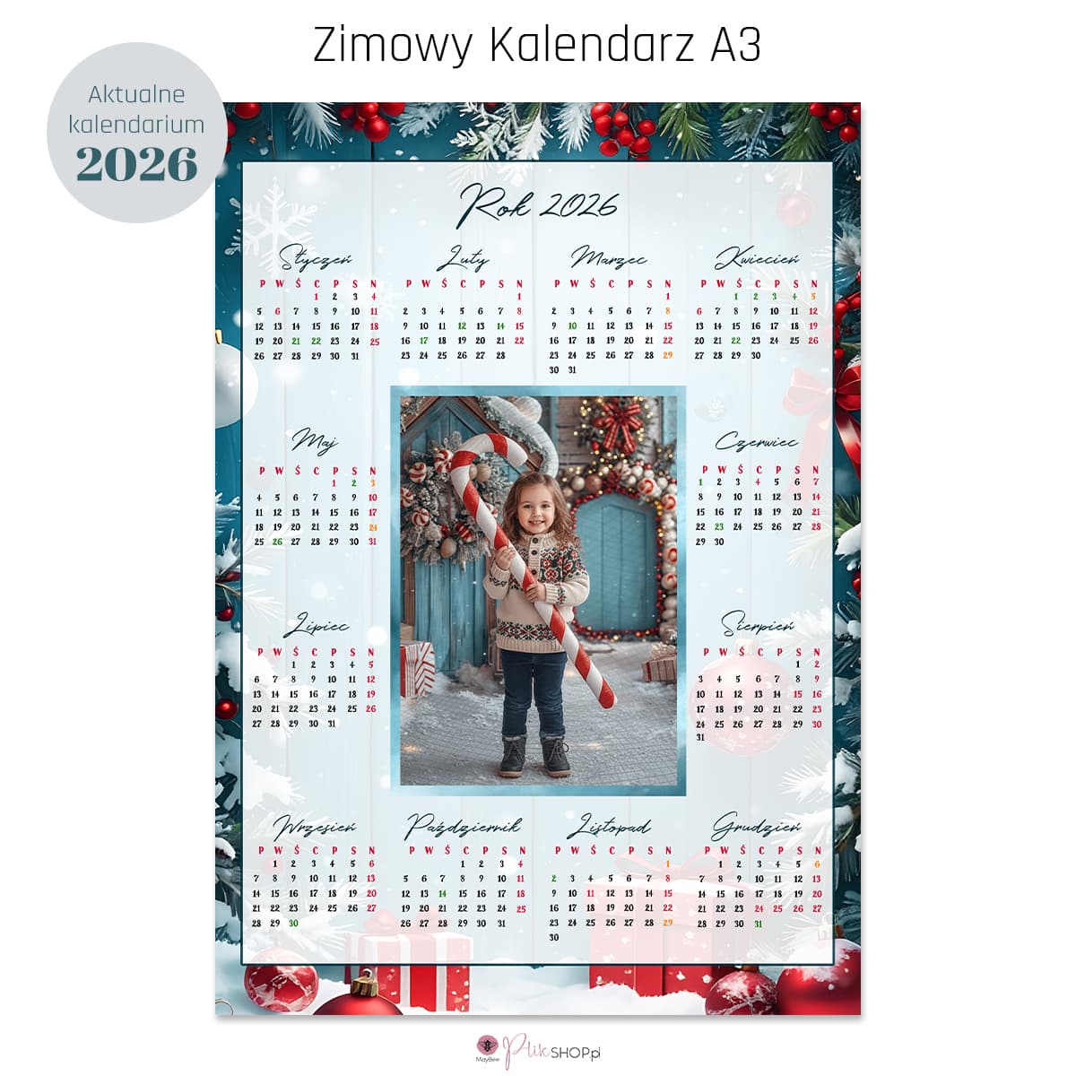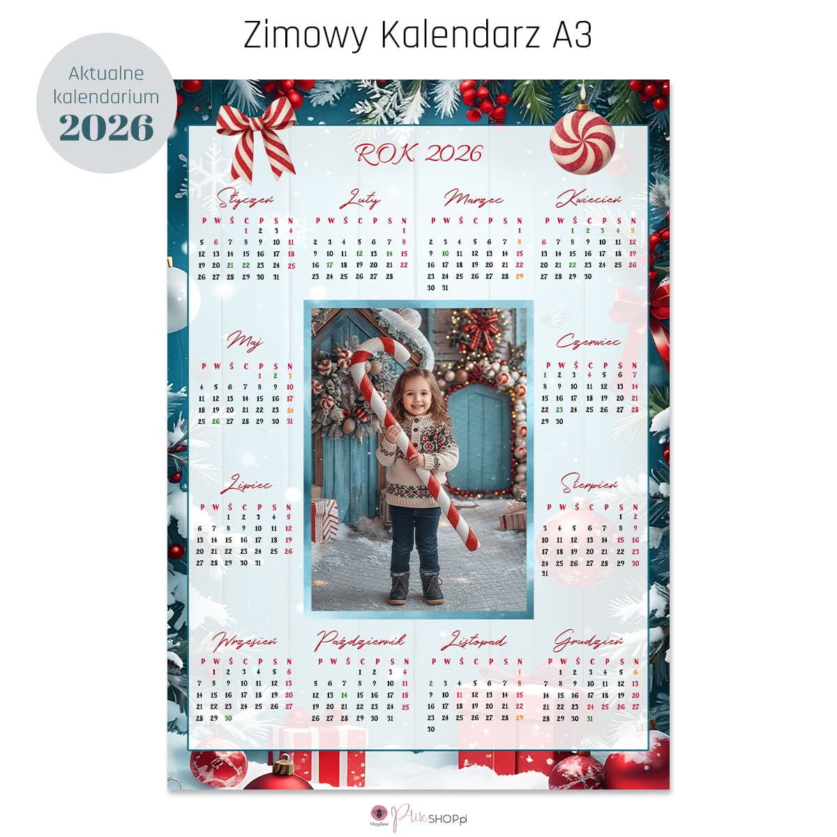 Zimowy kalendarz fotograficzny A3 utrzymany w radosnym, świątecznym nastroju z cukierkową nutką. Idealny do sesji dziecięcych lub rodzinnych w świątecznym czasie. Projekt wypełniony jest zimową świeżością, świątecznymi detalami i słodkimi akcentami – czerwone laski cukrowe, kokardy, świerk i śnieg tworzą przytulny, magiczny nastrój.