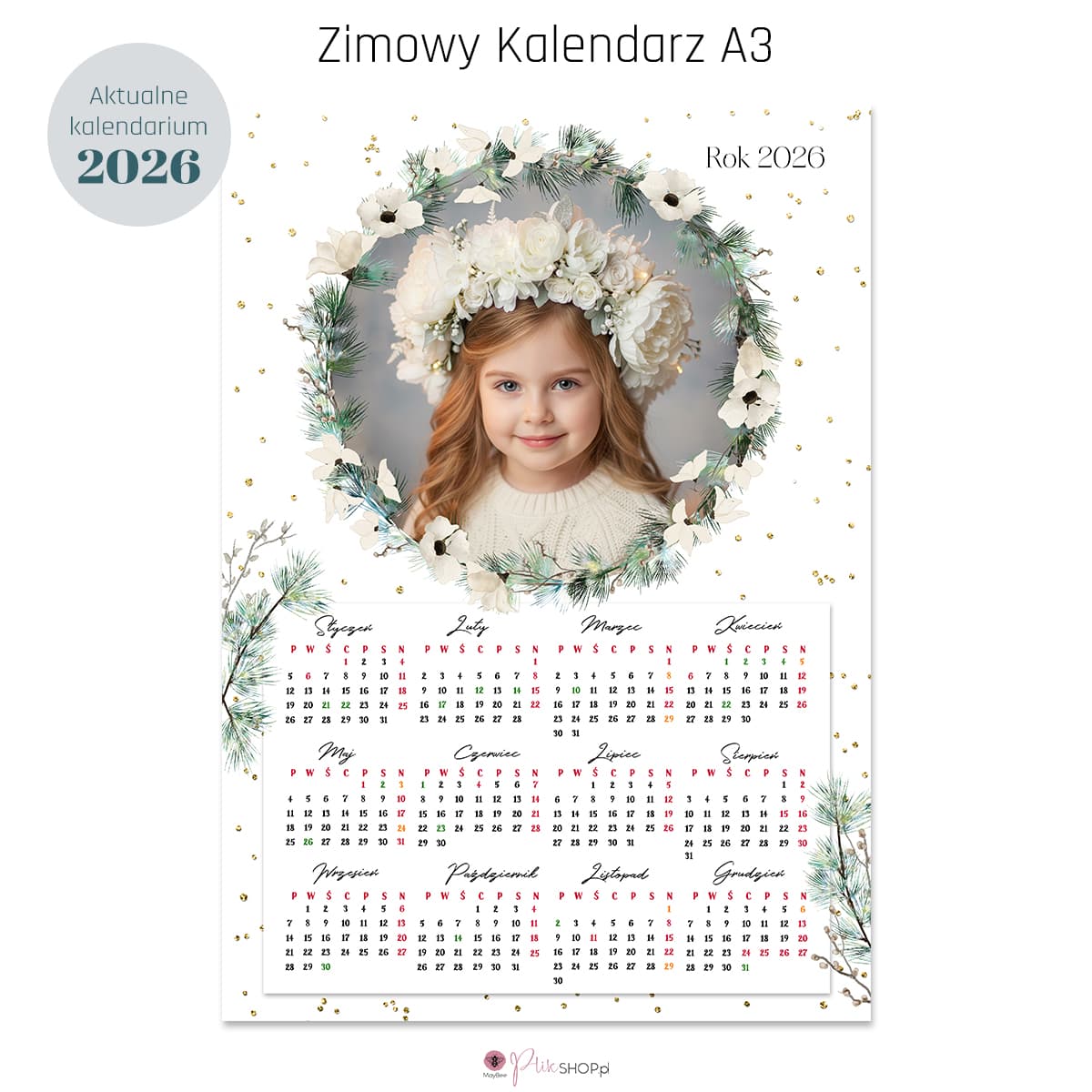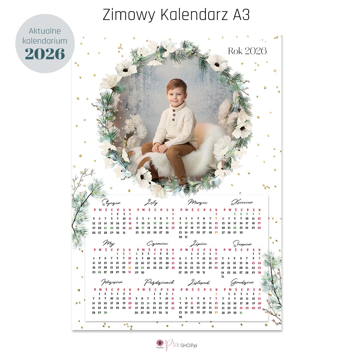kalendarz 2026, kalendarz A3, zimowy kalendarz, świąteczny kalendarz, okrągła ramka, zdjęcia pion i poziom, dla fotografa, szkoła, przedszkole, mini-sesje, prezent dla rodziny, PSD i PNG, plik do druku, fotografia rodzinna, fotografia szkolna, kalendarz do przedszkola